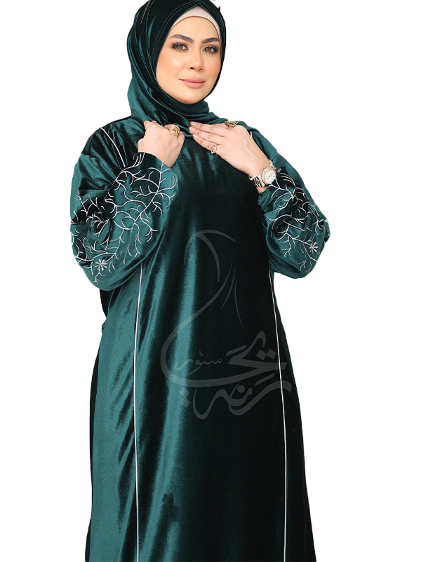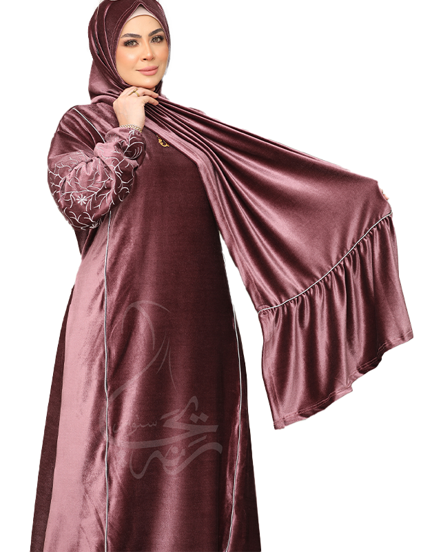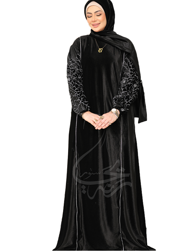 إسدال قطيفة شتوي أنيق بتفصيلة طوليّة وتطريز خفيف على الأكمام، مع طرحة ناعمة مميزة، يناسب الأجواء الباردة والمناسبات الهادئة.