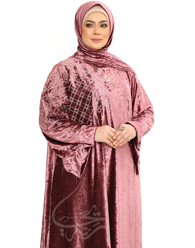 إسدال قطيفة ملوّنة بتطريز هندسي متموّج على الكتف وأكمام واسعة، مع طرحة مرفقة. تصميم أنيق وعملي يناسب الشتاء ومتوفر بألوان مثل الوردي والمستردة.